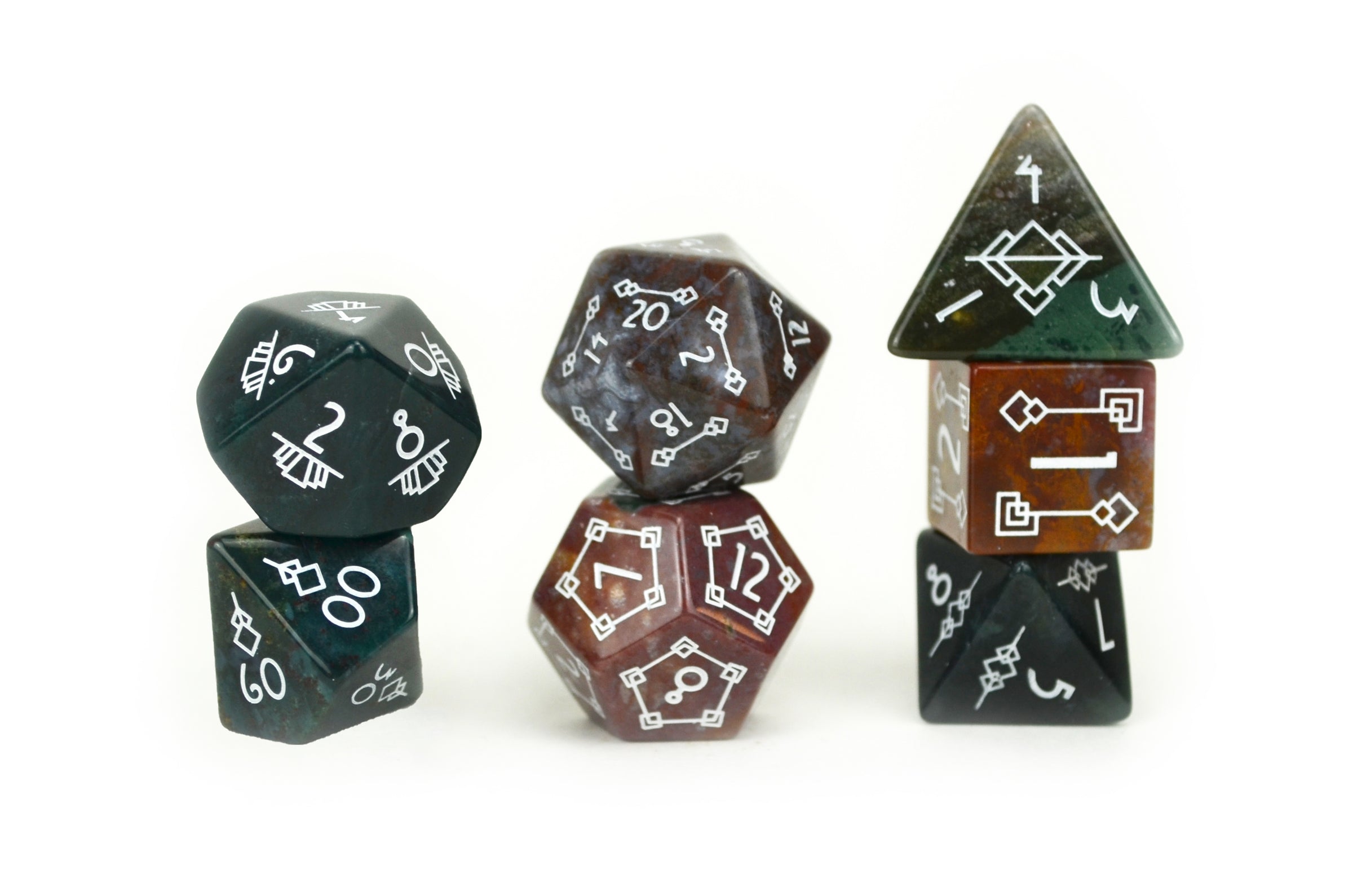 Natural Stone Disclaimer: Please note when ordering a set of our Semi-Precious Dice, they are created from natural materials, and there will be differences between every die. Our Semi-Precious Dice are hand-crafted, so there may be minor variations such as slight size differences, asymmetrical faces, or off-centre numbering. As such, each die is unique and may not be perfectly symmetrical; their roll is as balanced as one would expect from acrylic dice.