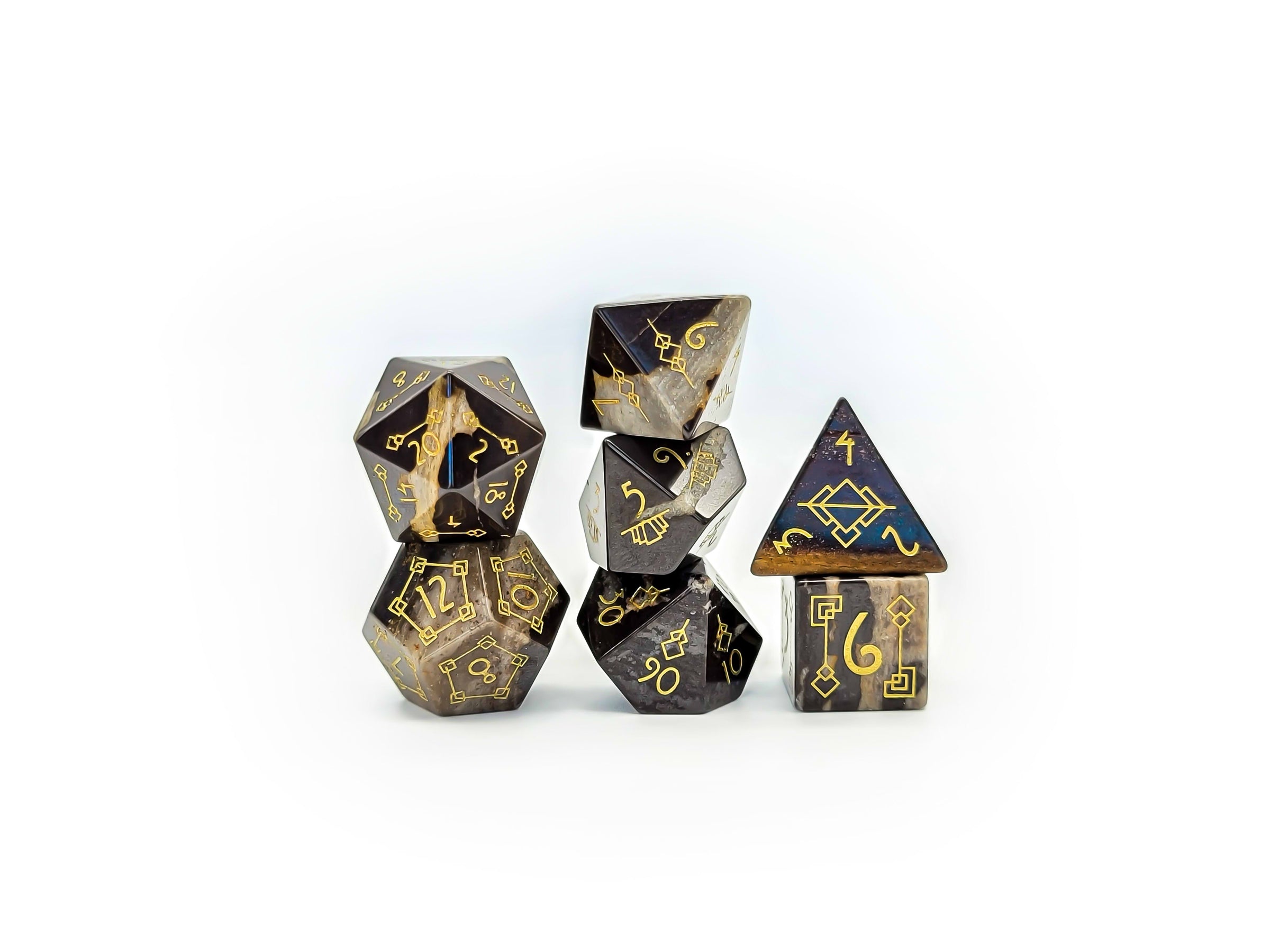 Natural Stone Disclaimer: Please note when ordering a set of our Semi-Precious Dice, they are created from natural materials, and there will be differences between every die. Our Semi-Precious Dice are hand-crafted, so there may be minor variations such as slight size differences, asymmetrical faces, or off-centre numbering. As such, each die is unique and may not be perfectly symmetrical; their roll is as balanced as one would expect from acrylic dice.