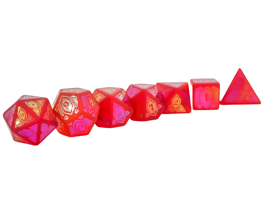 Our Glyphic Range Dice feature entirely original designs produced in-house. Every design is a new and unique design based around a particular theme, giving you a marriage of design and material. All our designs have two key concepts in mind, style, and number legibility so that they can look stunning and be functional as well.