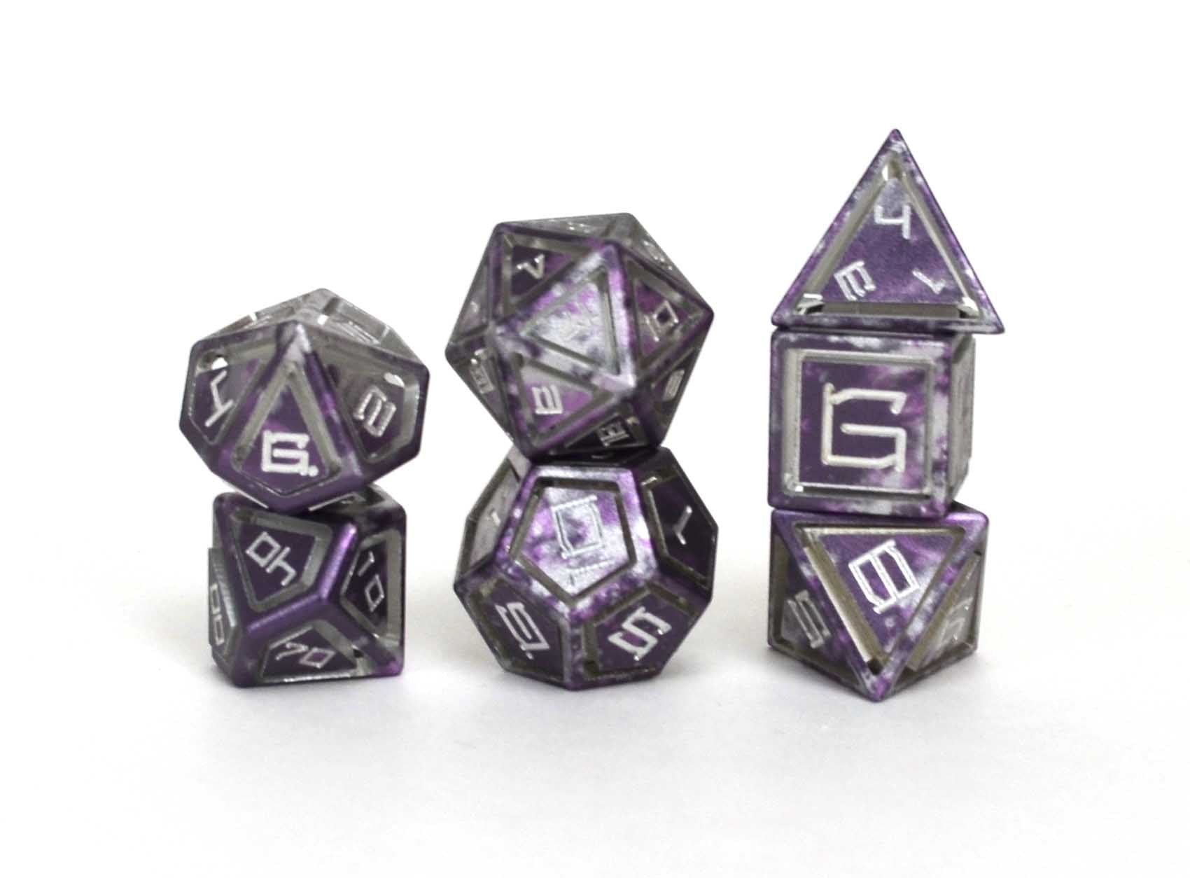Our Caged Aluminium Dice are cut from a single piece of metal, with the first steps following along the other aluminium dice of CNC machined and Anodized, but they then go through an extra step. Small slivers of the dice are cut away until the dice appear to be “caged.” This process alone can take several days per dice!.