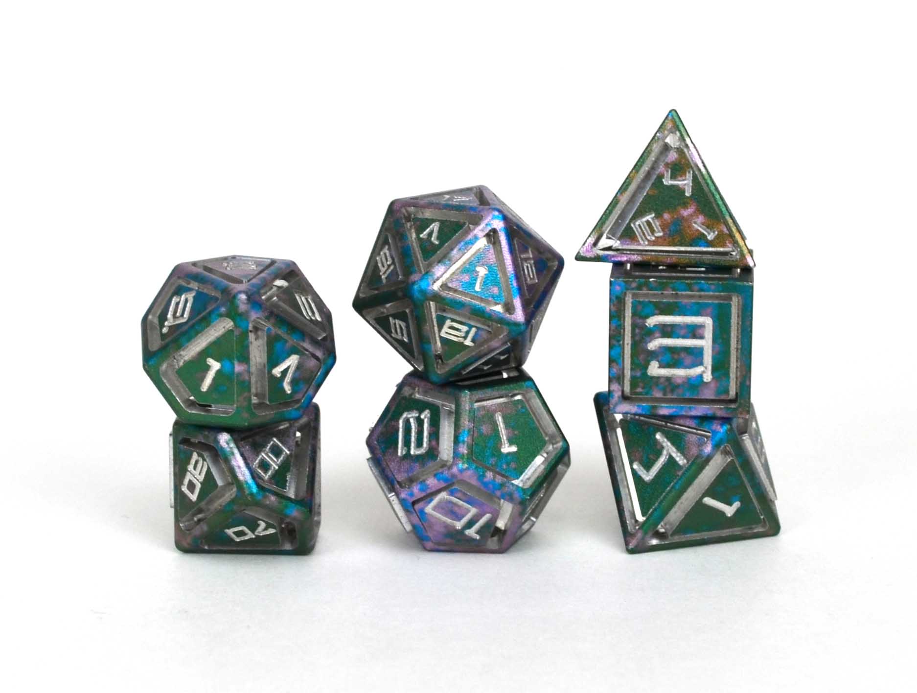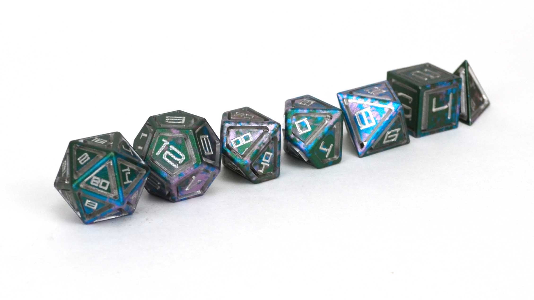 Our Caged Aluminium Dice are cut from a single piece of metal, with the first steps following along the other aluminium dice of CNC machined and Anodized, but they then go through an extra step. Small slivers of the dice are cut away until the dice appear to be “caged.” This process alone can take several days per dice!.