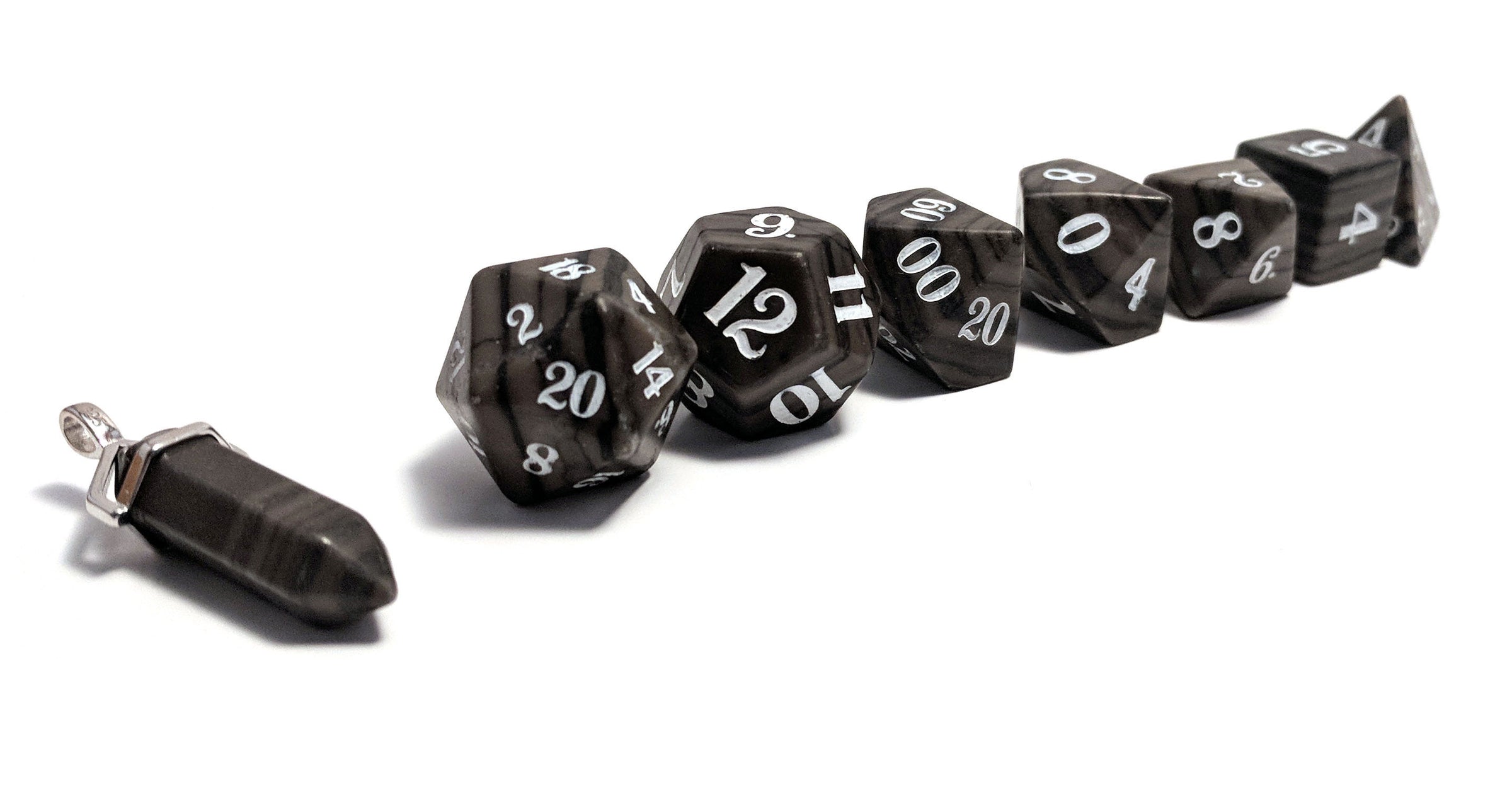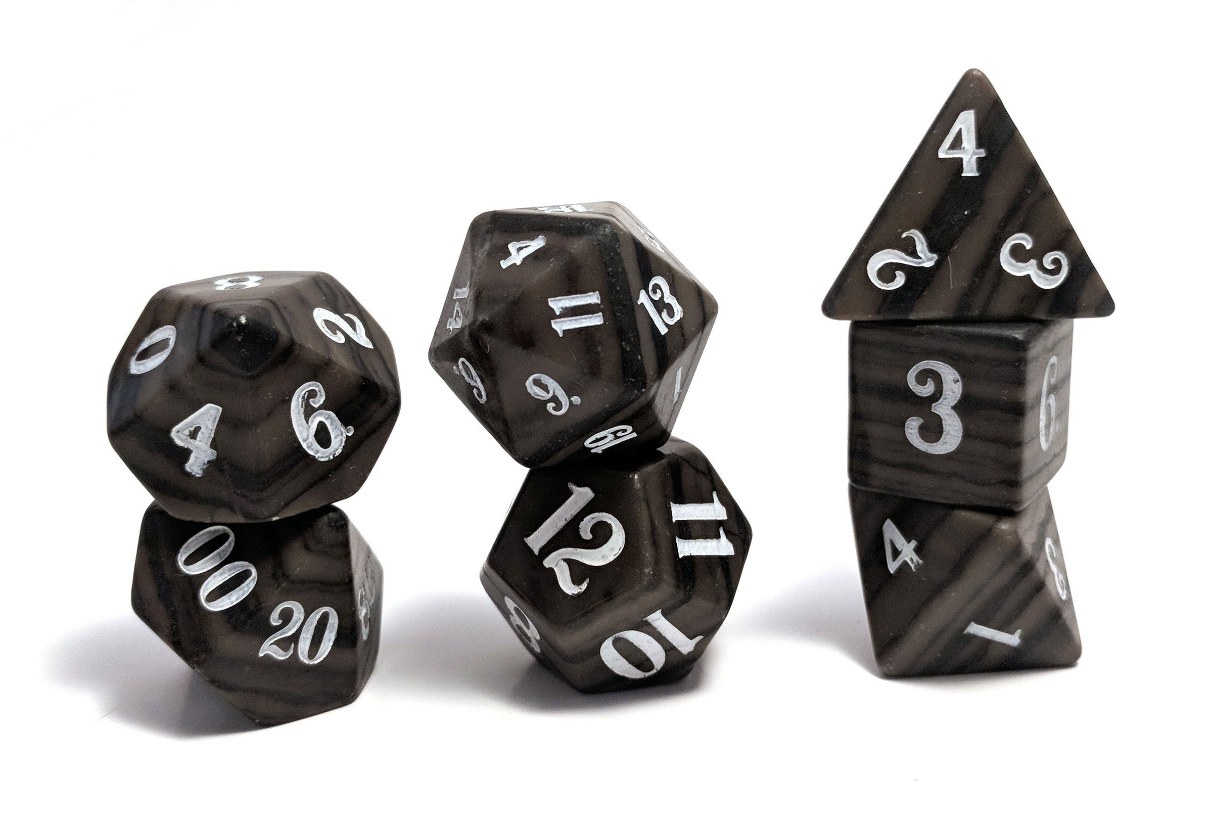 Natural Stone Disclaimer: Please note when ordering a set of our Semi-Precious Dice, they are created from natural materials, and there will be differences between every die. Our Semi-Precious Dice are hand-crafted, so there may be minor variations such as slight size differences, asymmetrical faces, or off-centre numbering. As such, each die is unique and may not be perfectly symmetrical; their roll is as balanced as one would expect from acrylic dice.