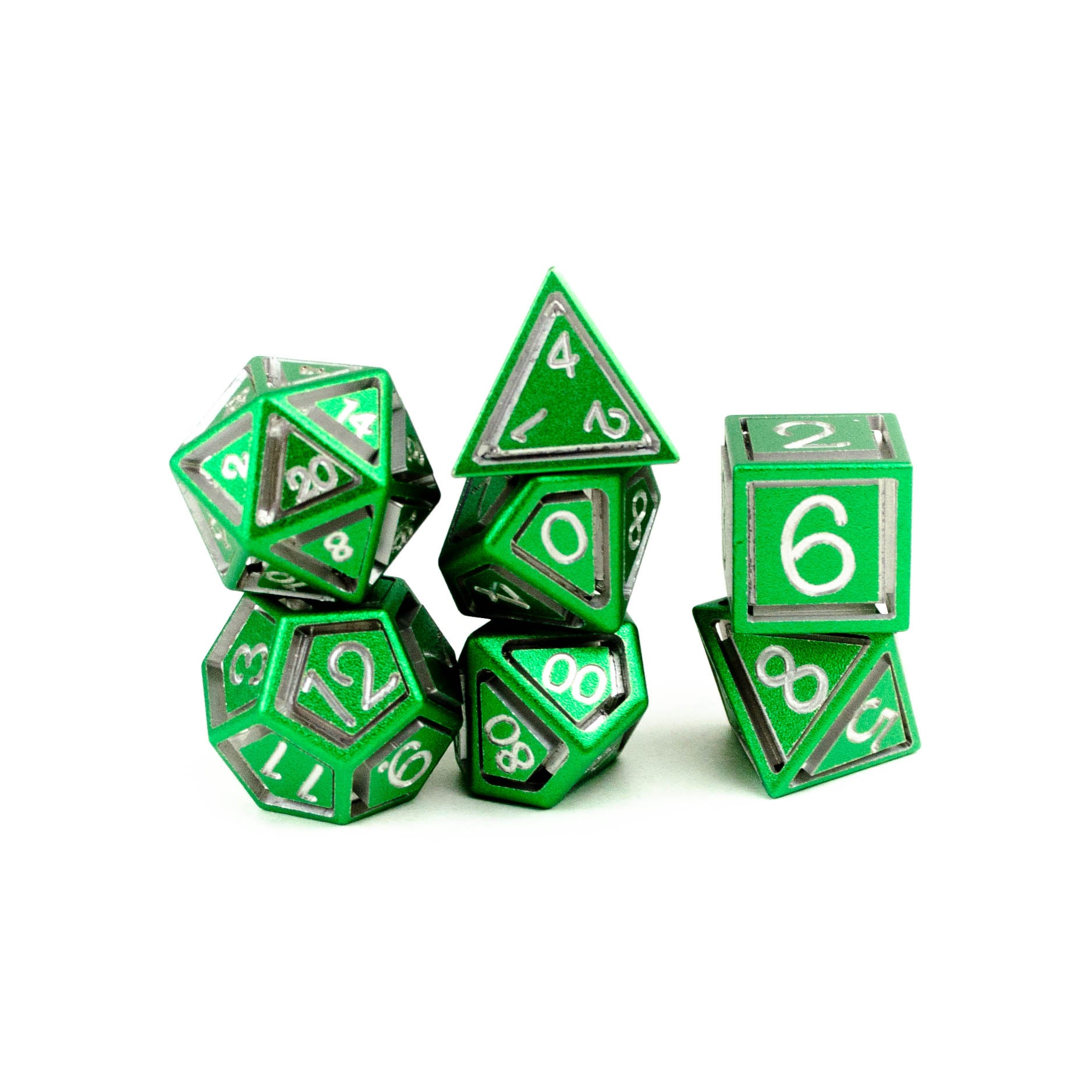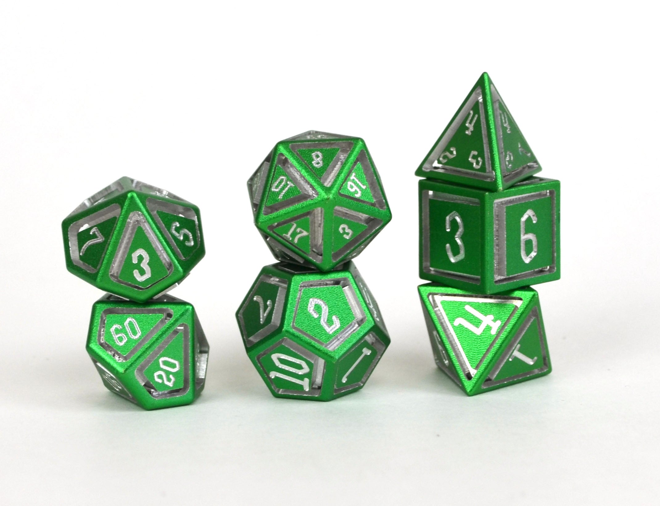 Our Caged Aluminium Dice are cut from a single piece of metal, with the first steps following along the other aluminium dice of CNC machined and Anodized, but they then go through an extra step. Small slivers of the dice are cut away until the dice appear to be “caged.” This process alone can take several days per dice!.