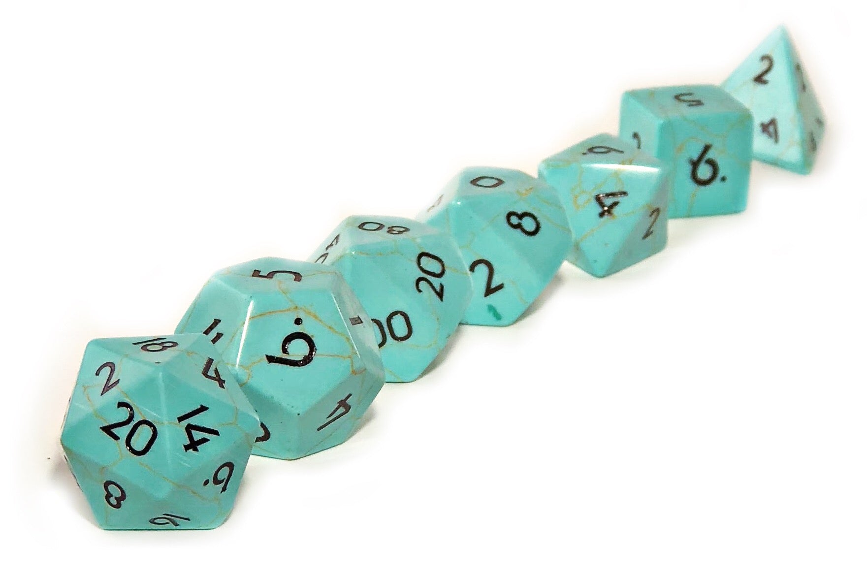 Natural Stone Disclaimer: Please note when ordering a set of our Semi-Precious Dice, they are created from natural materials, and there will be differences between every die. Our Semi-Precious Dice are hand-crafted, so there may be minor variations such as slight size differences, asymmetrical faces, or off-centre numbering. As such, each die is unique and may not be perfectly symmetrical; their roll is as balanced as one would expect from acrylic dice.