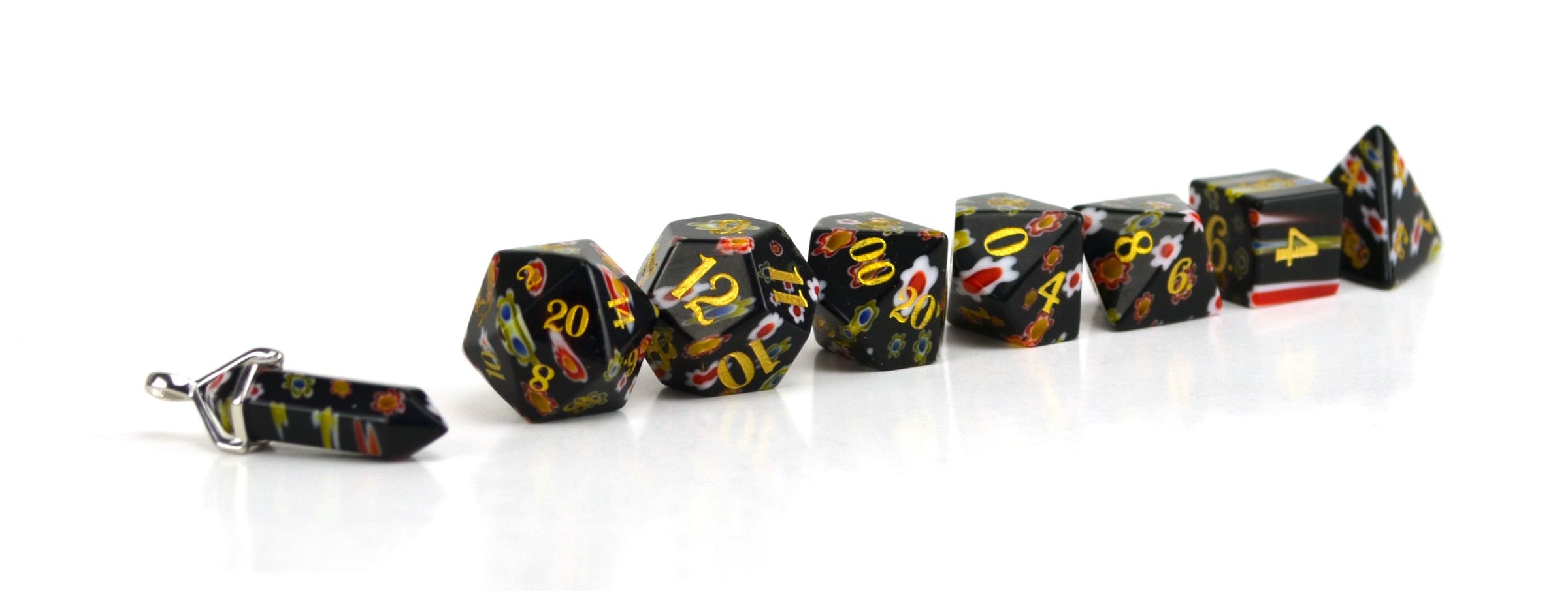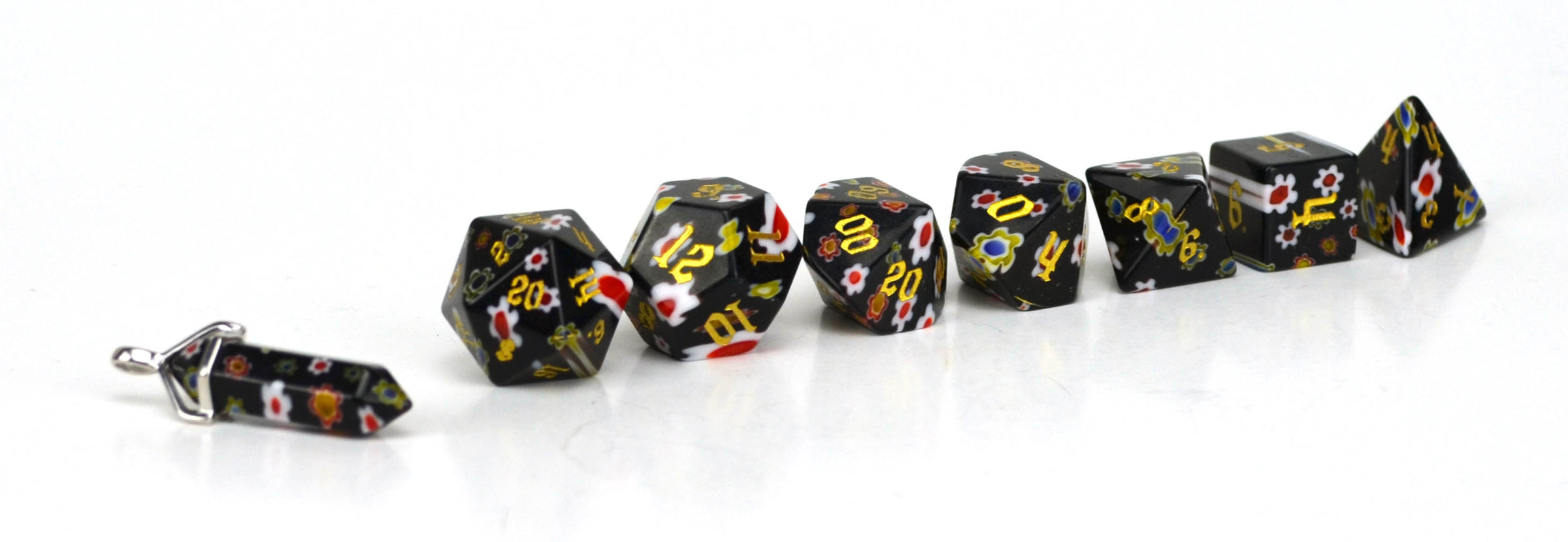 Our rock candy dice are made from millefiori glass, this design is created with multiple glass rods, melted together to create vibrant and unique patterns. Our glass is silica based and durable enough to be rolled on a soft surface such as a leather or felt tray.