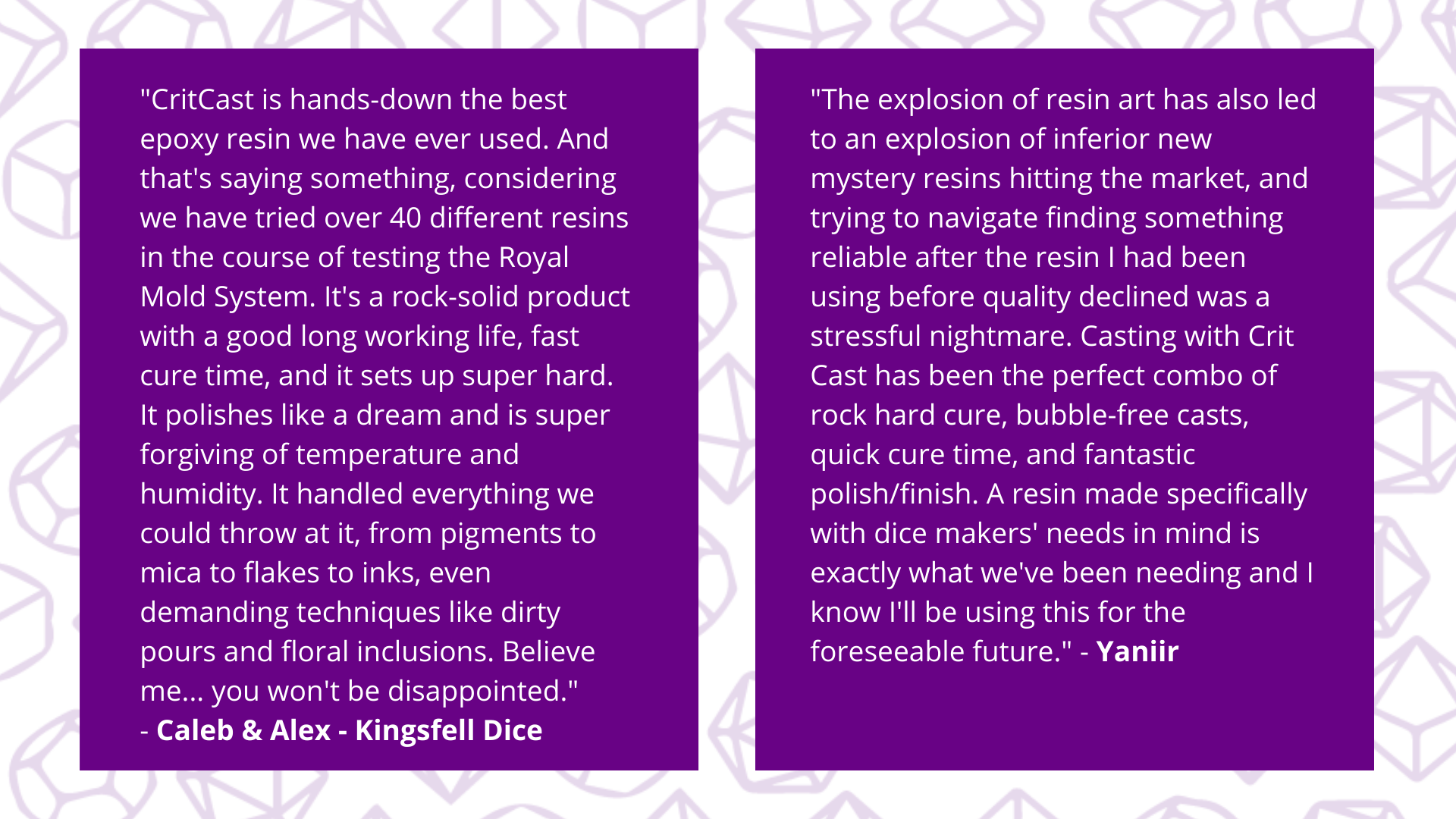 | "CritCast is hands-down the best epoxy resin we have ever used. And that's saying something, considering we have tried over 40 different resins in the course of testing the Royal Mold System. It's a rock-solid product with a good long working life, fast cure time, and it sets up super hard. It polishes like a dream and is super forgiving of temperature and humidity. It handled everything we could throw at it, from pigments to mica to flakes to inks, even demanding techniques like dirty pours and floral inclusions. Believe me... you won't be disappointed." - Caleb & Alex - Kingsfell Dice |