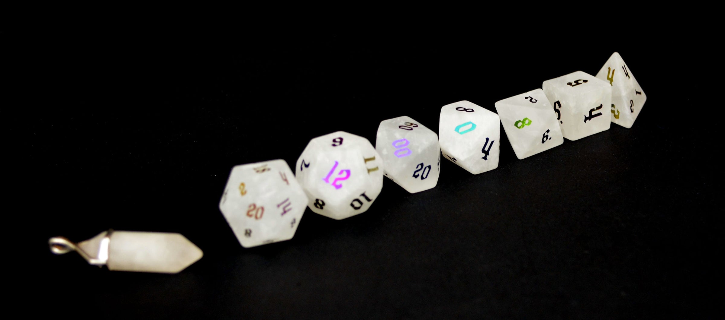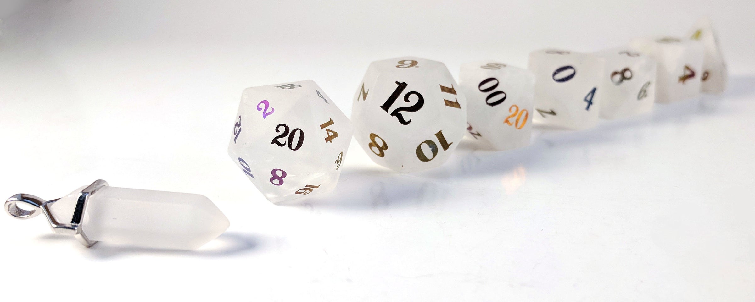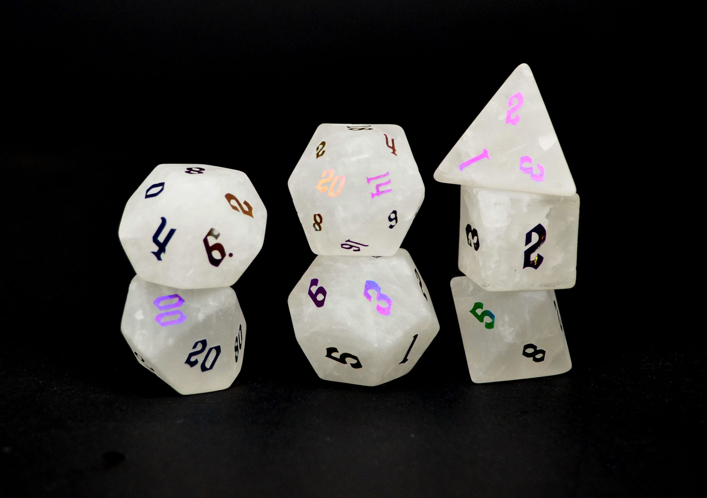 Natural Stone Disclaimer: Please note when ordering a set of our Semi-Precious Dice, they are created from natural materials, and there will be differences between every die. Our Semi-Precious Dice are hand-crafted, so there may be minor variations such as slight size differences, asymmetrical faces, or off-centre numbering. As such, each die is unique and may not be perfectly symmetrical; their roll is as balanced as one would expect from acrylic dice.