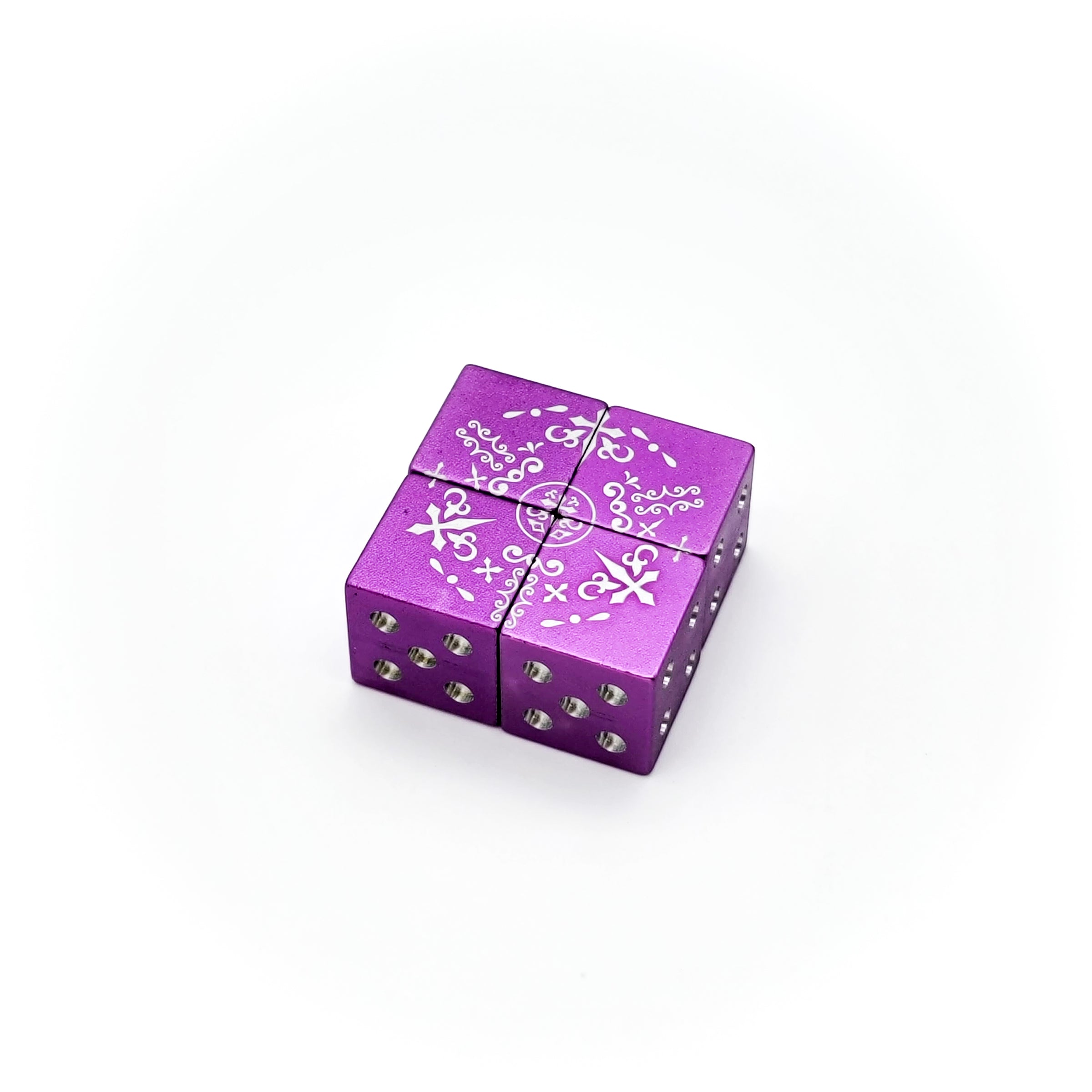 These Aluminium masterpieces designed inhouse, sport 4 D6s in a solidified metal casing. Equipped with a magnetic top, the Dwarven Dice smiths of the College have prepared many these D6s to join together creating a design matching Shadow Masque.