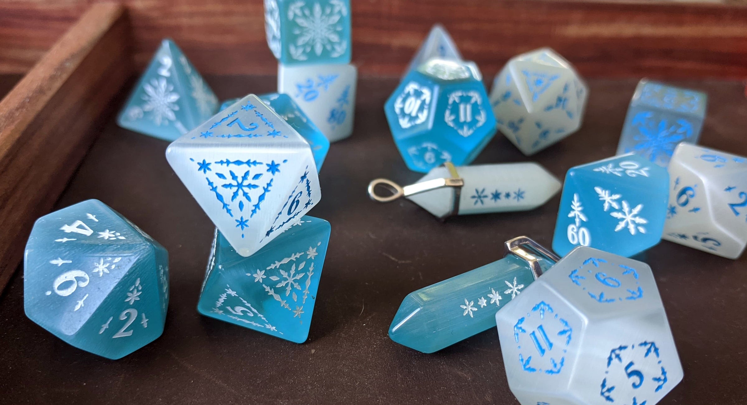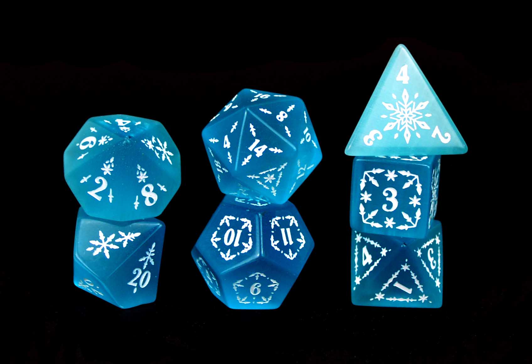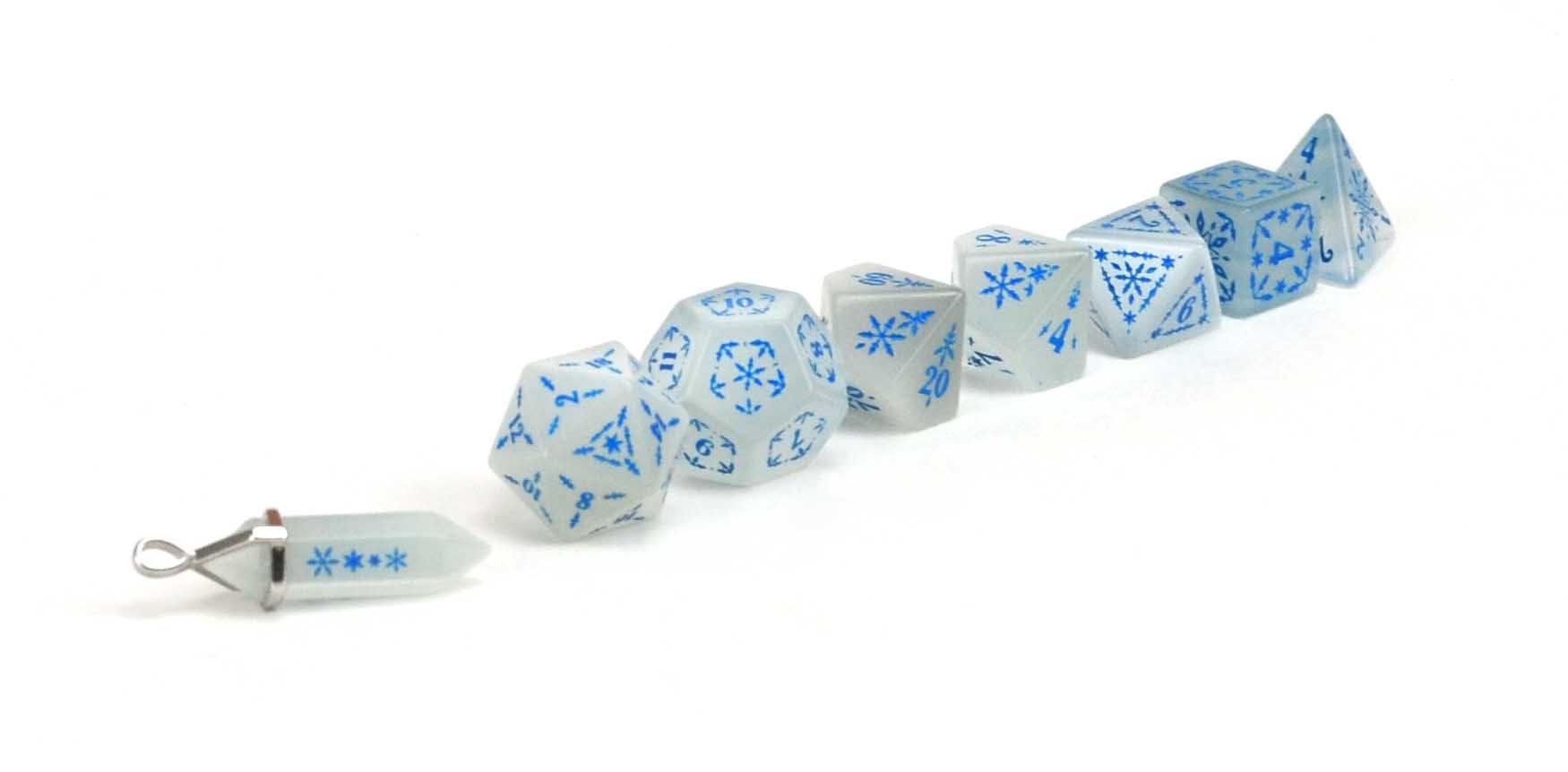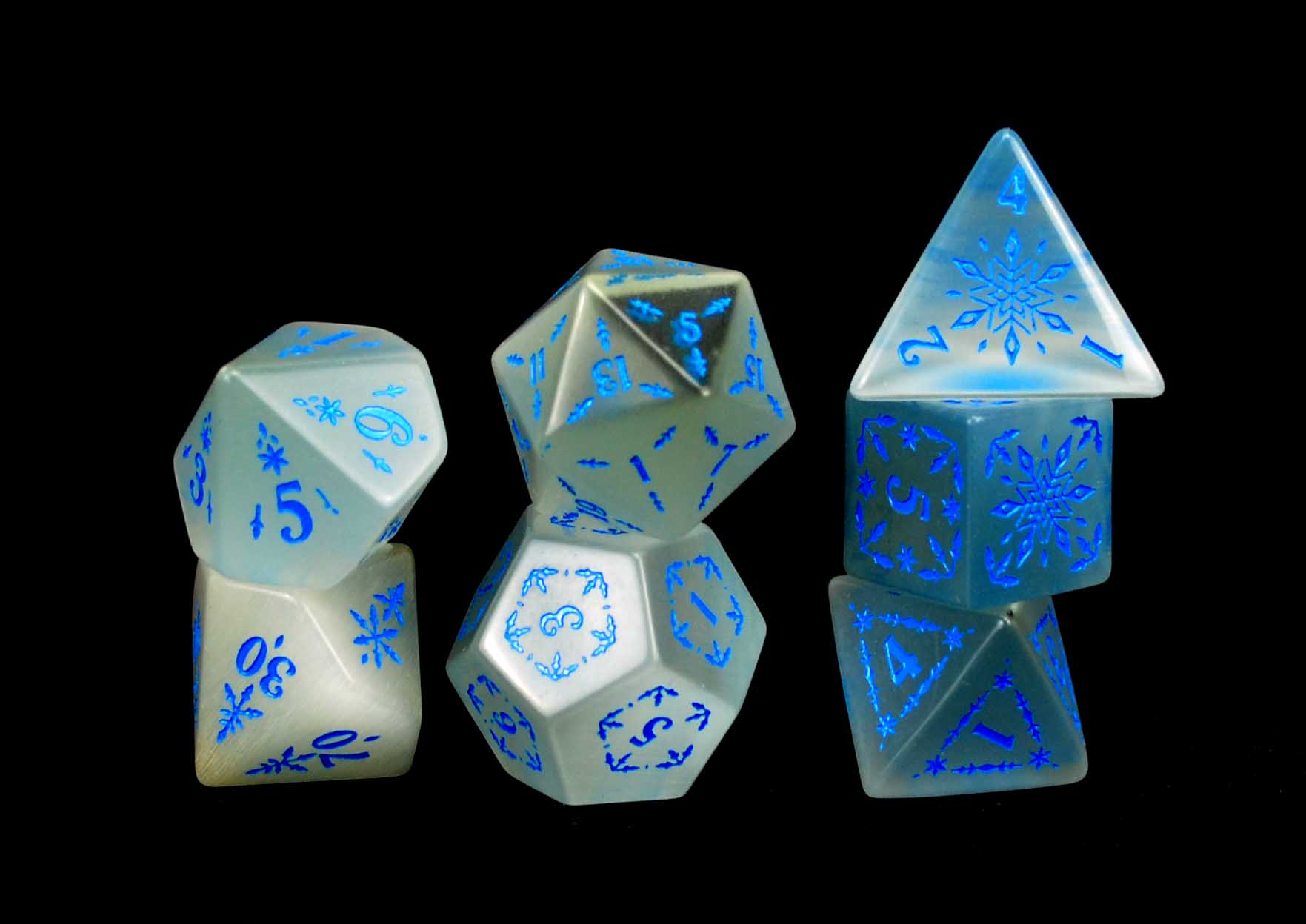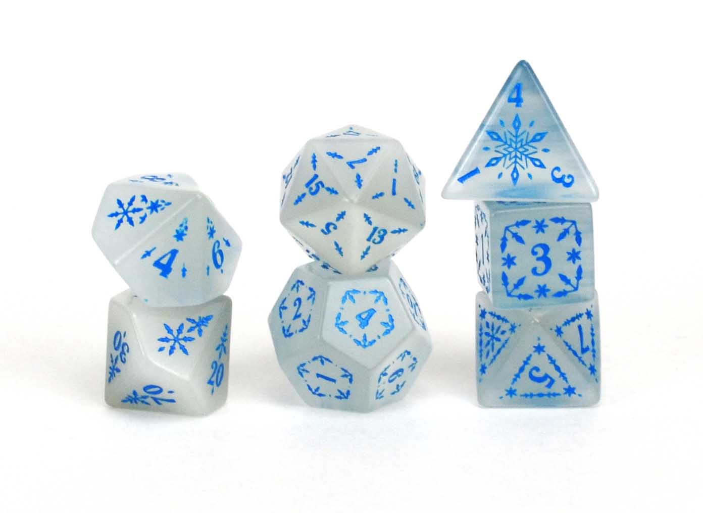 This brand new snowflake/winter design, debuting during Christmas in July, pays homage to the beautiful snowflakes of the world. Because of it's material and hand-carved elements, each die is unique, just like snowflakes. But unlike snowflakes, these dice will not melt away in the heat of battle, but remain by your side forevermore.